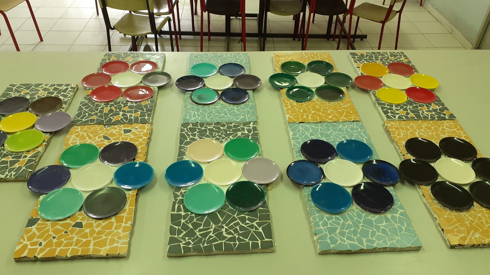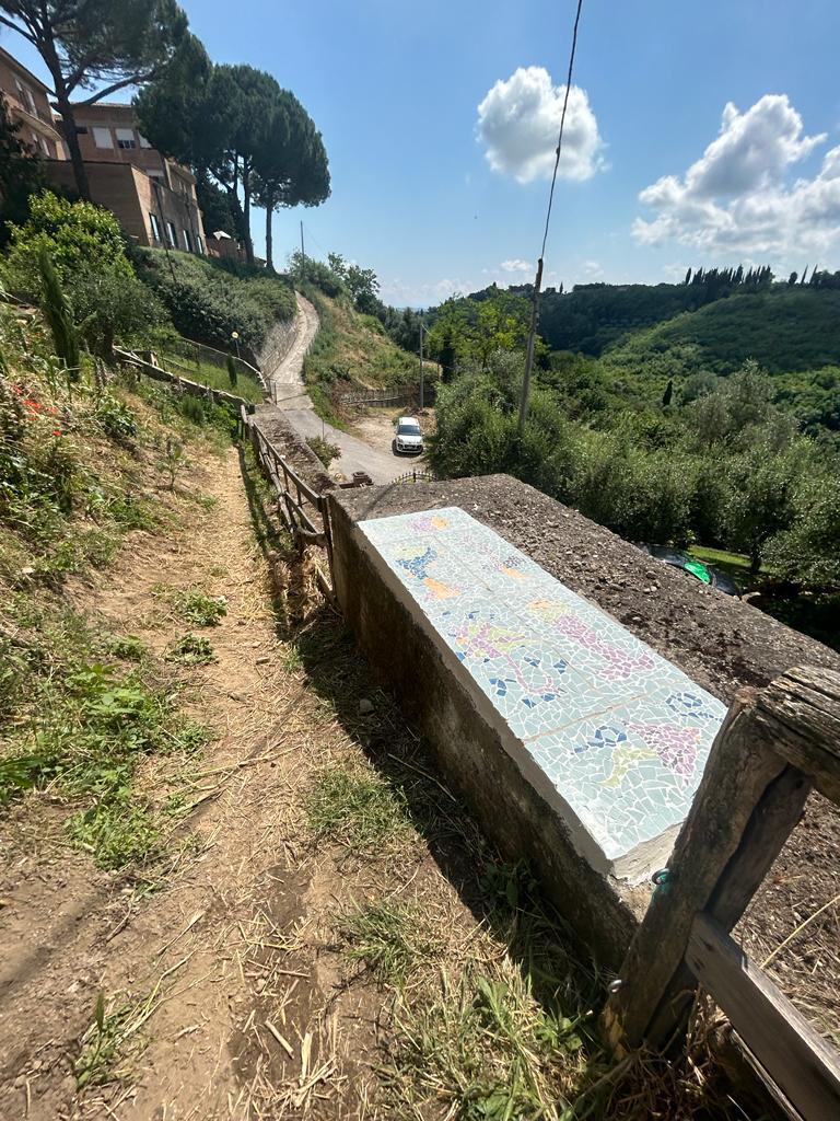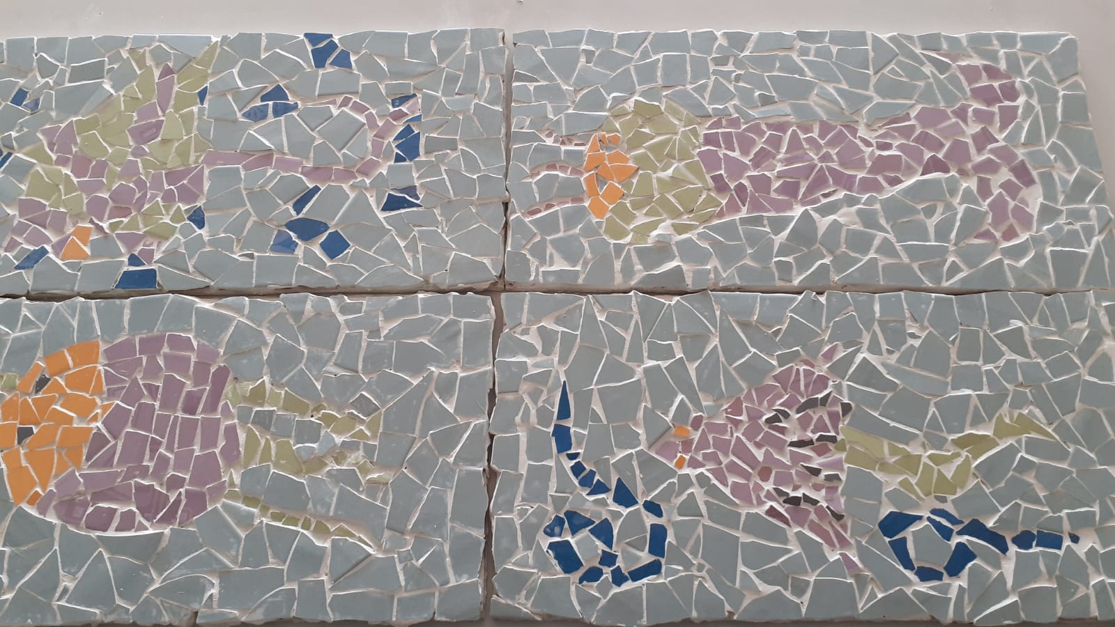 Una delle ultime attività al vicolo è stata la realizzazione di mosaici, ben 9 pannelli, realizzati con materiali di risulta, vecchie piastrelle e piattini in ceramica, che hanno abbellito il muro di contenimento in cemento armato.